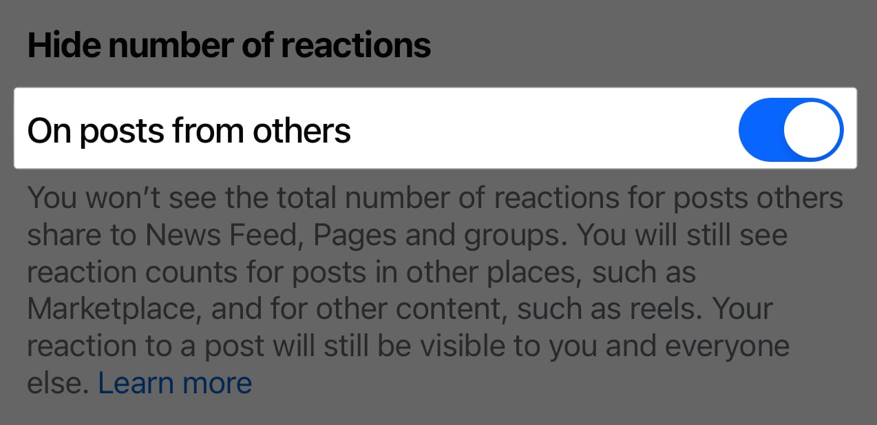 さらに、切り替えることができます他の人からの投稿他の人が共有する投稿の反応の総数を表示したくない場合。