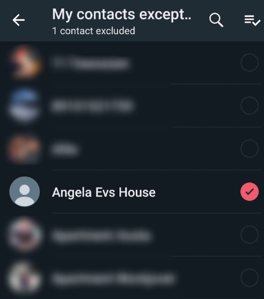 - 私の連絡先を除いて:最後に見たステータスを表示できない連絡先を手動で選択します。