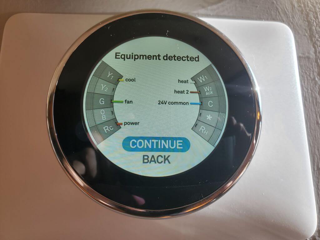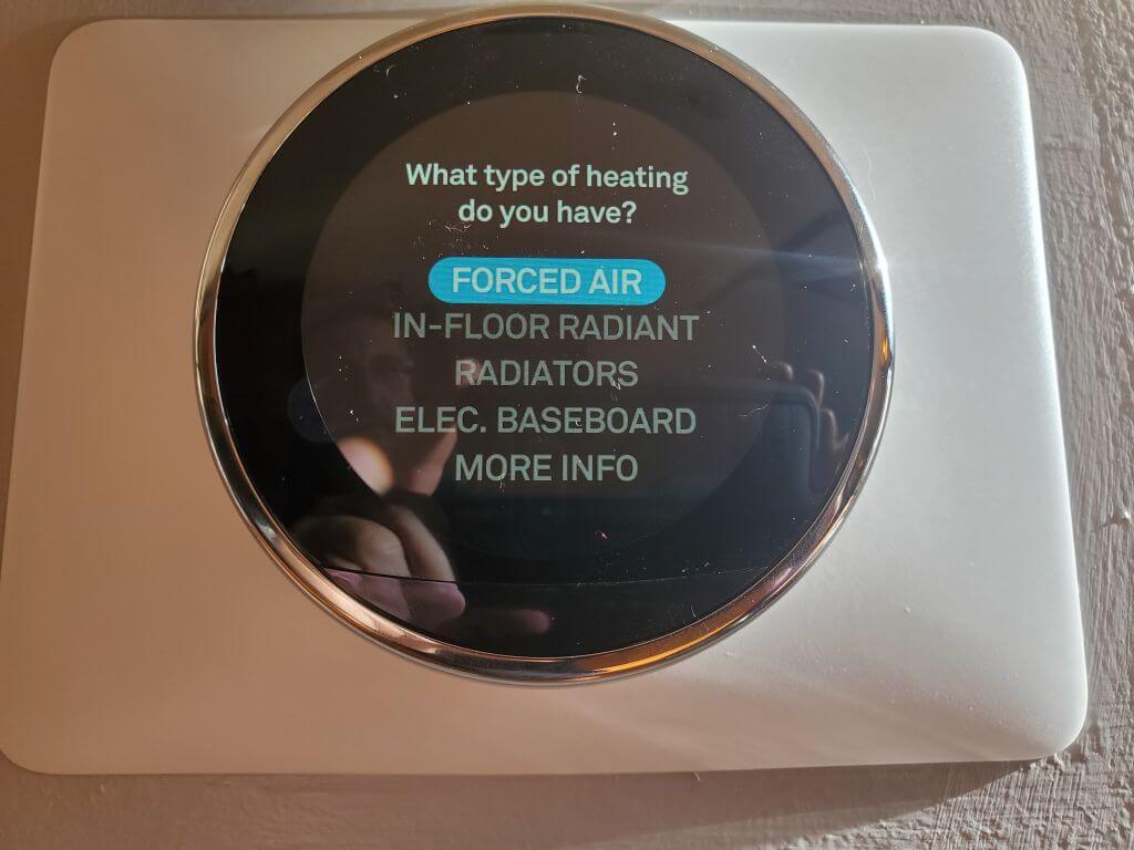 - 巣の外側のフレームを回してから、サーモスタットの表面を押して選択して選択して選択します。その後、巣は、取り付けられた配線で検出されたHVAC機器の表示など、いくつかの初期セットアップ手順を説明します。