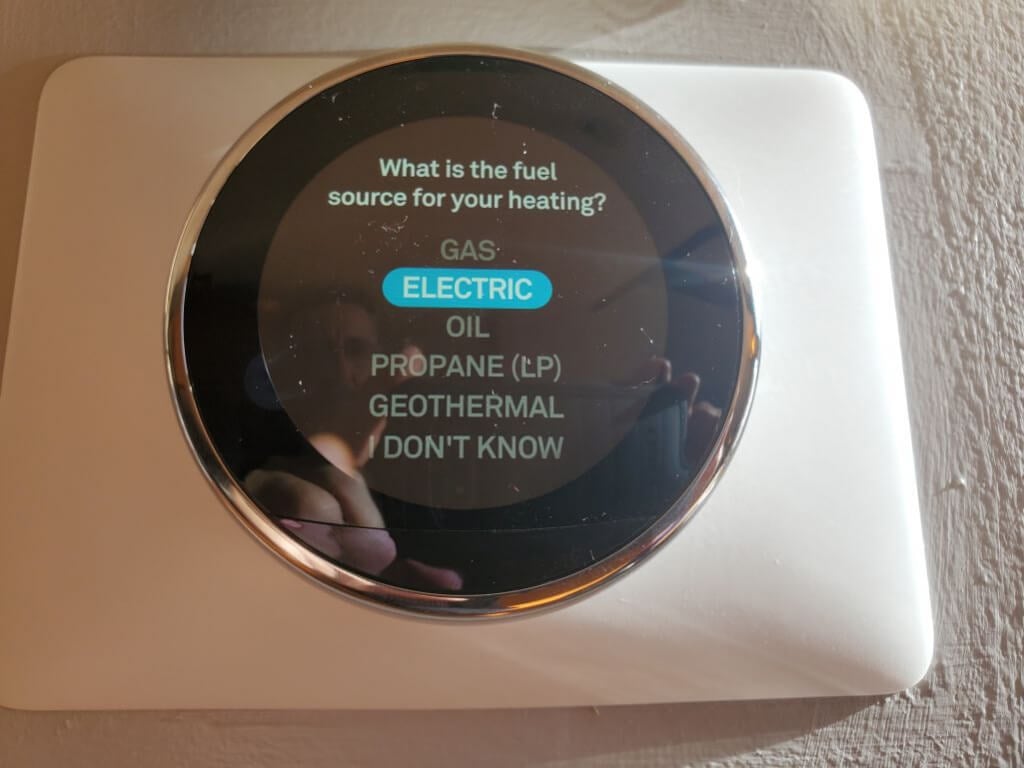 - 選択します続くシステム機器を確認するために数回。次に、暖房システムが使用する燃料を選択するオプションが表示されます。巣のフレームをねじってそれを選択し、ネストディスプレイを押して選択します。