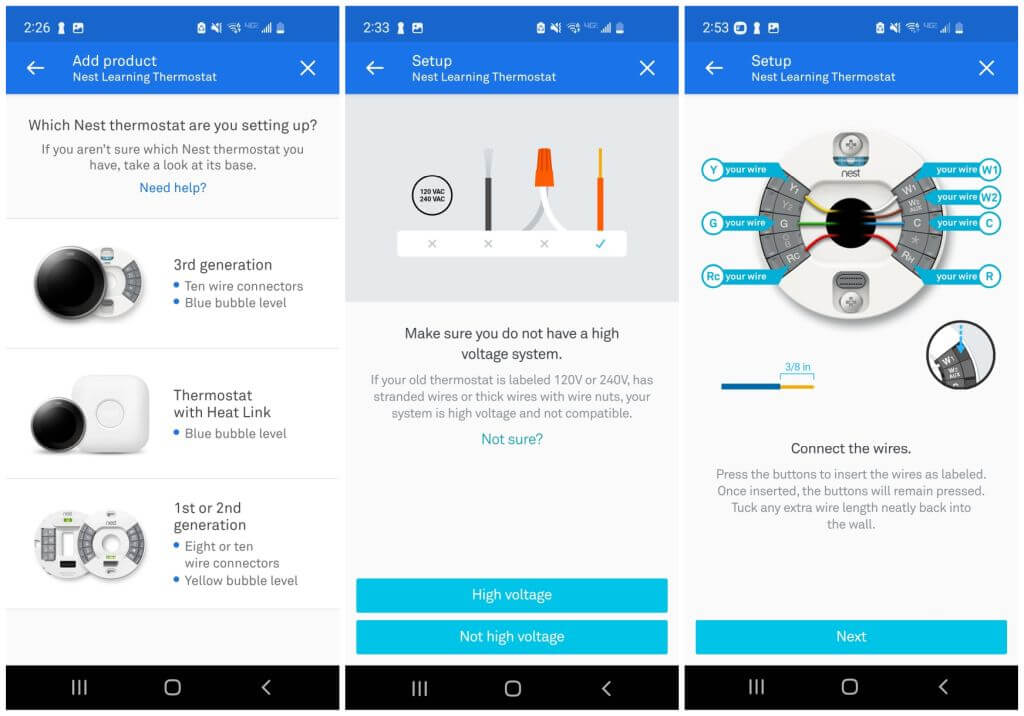 - 上記のセクションのハードウェアインストール手順を既に完了した場合は、所有するネストサーモスタットの生成をタップして、エントリキー画面に到達するまで次の2つの画面をタップしてください。配線図が正しく、高電圧システムではなく低電圧があり、配線図が正しいことを確認する必要があります。
