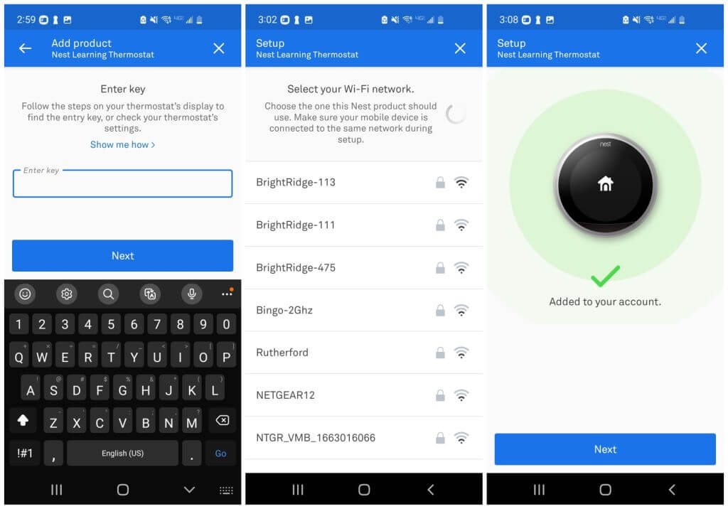 - 選択しますエントリキーサーモスタットがまだコードを表示していない場合。次に、サーモスタットに表示されたコードを入力しますキーを入力しますアプリのフィールド。次に、利用可能なネットワークのリストからWi-Fiネットワークを選択し、選択します次アカウント確認画面。