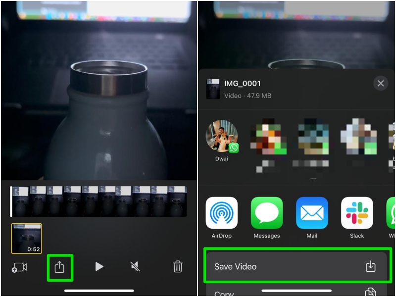 ただし、必要に応じて写真アプリの最終カットカメラアプリからビデオ録画を保存しますあなたのiPhoneで、あなたはできます[共有]ボタンをタップします共有シートを持ち上げてタップしますビデオを保存しますメニューのオプション。