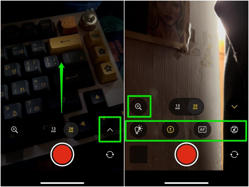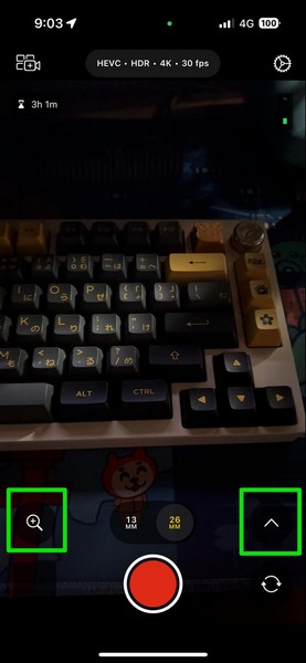 レンズスイッチャーの横には、ズームコントロールボタンとrowボタンそれぞれ左側と右側。アップアローボタンをタップするか、単にビデオプレビューをスワイプすると、追加のプロコントロールボタンが表示されます。この記事の後半の部分の専用セクションで、それぞれについて説明しました。