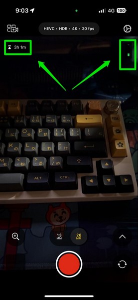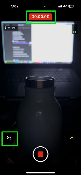 ビデオの録音を開始した後、タイマーは上から始まりますオーディオレベルとビデオリミット通知者が自分のスペースにあります。あなたもそうしますズーム制御ボタンを見つけますビデオプレビューの左下にタップしてズームスライダーにアクセスします。