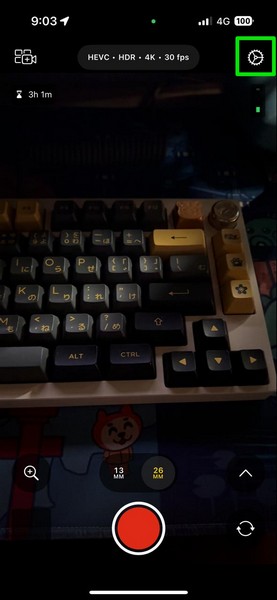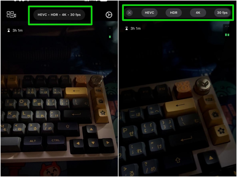 上記のメニューバーの次のインタラクティブな要素に移動すると、コアビデオ設定を調整するための設定バー。これをタップして展開し、ビデオコーデックをに設定できますHEVCまたはApple Pro-Res、選択HDRまたはSDRの色とダイナミックレンジ、ビデオ解像度を設定します、 そしてフレームレート(FPS)を調整する。完了したら、タップするだけですxボタン左端にメニューを崩壊させます。
