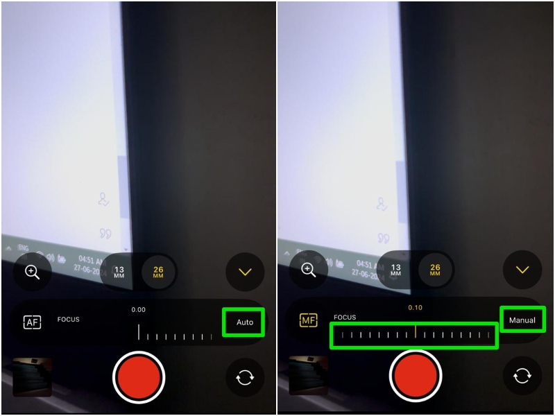 ただし、デバイスで最終カットカメラアプリを使用しているときにビデオショットの焦点を手動で制御する場合は、タップすることができます。自動オプションそれをに切り替える右側手動モードまたはスライダーを使用して、手動フォーカスに自動的に切り替えるだけです。