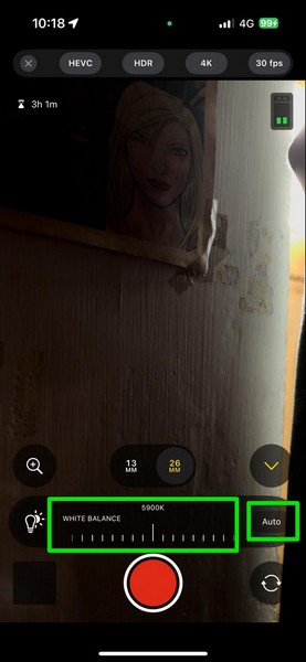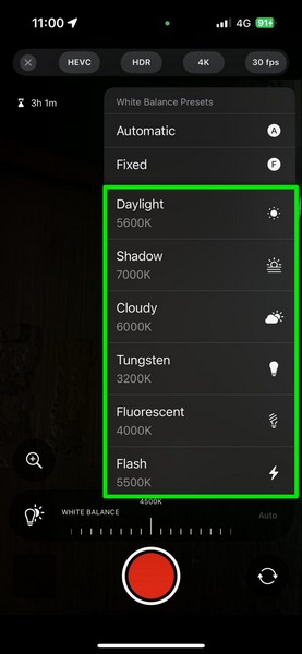 ホワイトバランスボタンをタップしますホワイトバランススライダーを明らかにしますあなたができること設定を手動で調整しますそしてリアルタイム効果を参照してくださいビデオプレビューで。デフォルトでは、に設定されています自動そしてホワイトバランスを自動的に調整します環境照明がシーンごとに変化するようにシーンの。