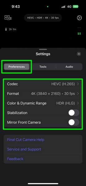 ビデオセッティングメニューバーの横には、アプリ内設定ボタンがあります。このボタンを使用すると、画面の下部から設定UIを開き、追加の設定にアクセスできます。がある3つのタブこのメニューで - 好み、ツール、 そしてオーディオ。
