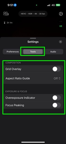 の下[ツール]タブ、 あなたはできるグリッドオーバーレイを有効/無効にします、ビデオを撮影しているときに3分の1のルールに従う場合に役立ちます。さらに、できますビデオのアスペクト比を調整します、過剰曝露インジケーターを有効/無効にします、 そしてピークに焦点を合わせます。後者の2つのオプション過剰露出エリアを強調表示しますそしてビデオショットに焦点を合わせたオブジェクト。