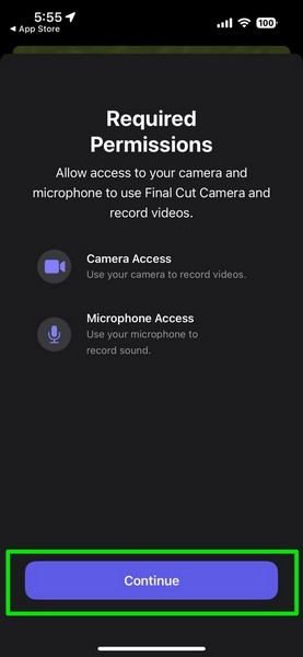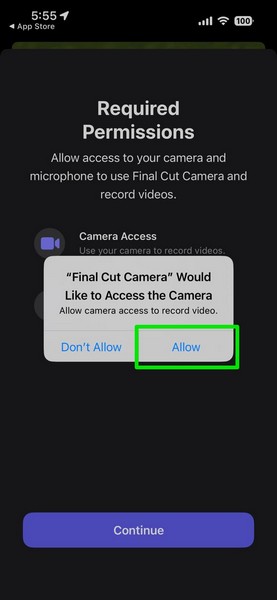 3。次に、あなたは頼まれますカメラとマイクのアクセスを有効にします最終的なカットカメラアプリ用。タップします続くボタン。