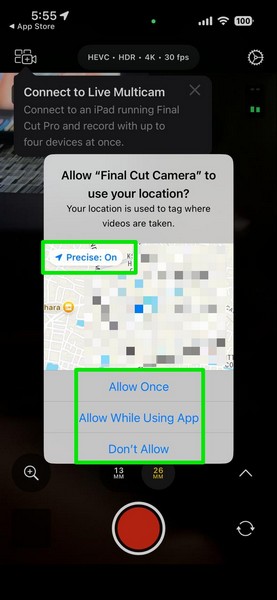 6。最終的なカットカメラアプリへのロケーションサービスアクセスを許可すると、記録したビデオをジオタグすることができます。したがって、最終的なカットカメラビデオをジオタグを付けたい場合は、正確なオプションで切り替えます選択しますアプリの使用中に許可しますオプション。
