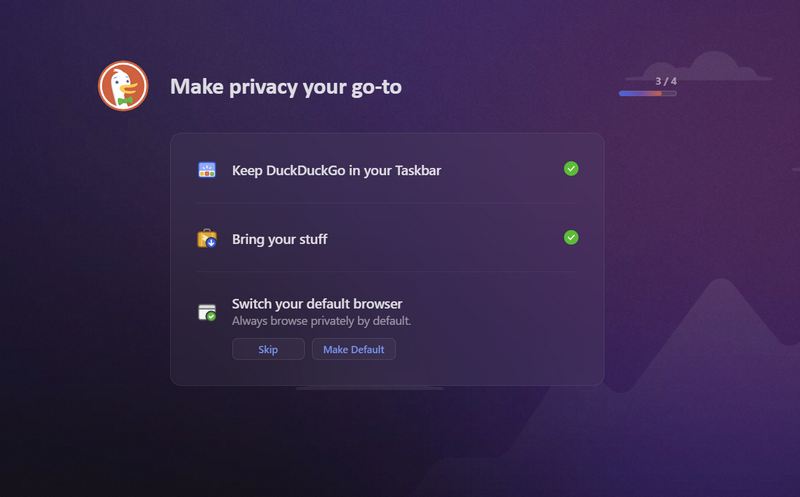 4。セットアッププロセスの3番目の部分が開始されたら、Windows 11タスクバーにDuckduckgoブラウザをピン留めして簡単にアクセスすることを選択できます。それ以外の場合は、をクリックできますボタンをスキップします。