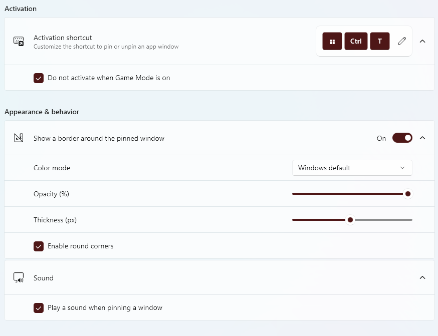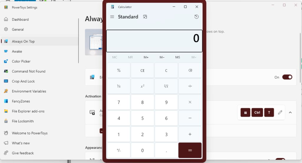 Microsoft Powertoysをインストールすると、常に上部の機能が既に有効になっているため、すぐに使用できる機能です。さらに、Powertoysアプリのツールのセクションに移動することにより、ショートカットキーの変更など、ゲームモードのときに機能を有効にすることなく、ピン留めアプリの周りに境界線を持ち、色モード、不透明度、厚さなどを変更するなど、カスタマイズすることができます。