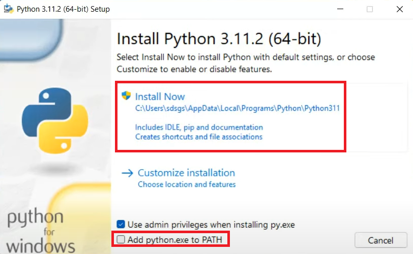 2。ホームページで、選択しますPython.exeをパスに追加しますオプションとクリックします今すぐインストールしてくださいボタン。