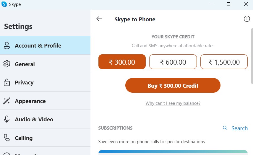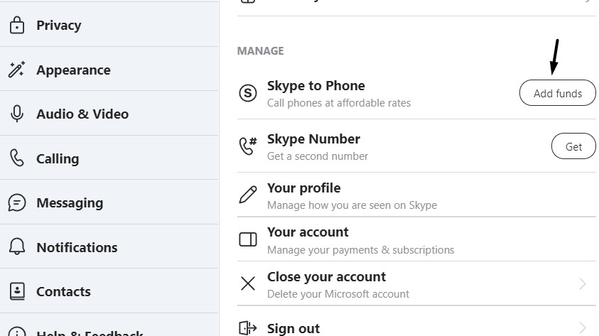 1。に移動します設定あなたのSkypeアプリクリックします資金を追加しますの隣にスカイプから電話。