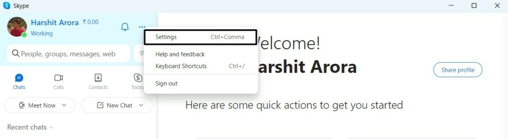 1。クリックします3つのドット(…)Skypeウィンドウの上部で選択します設定ドロップダウンメニューから。