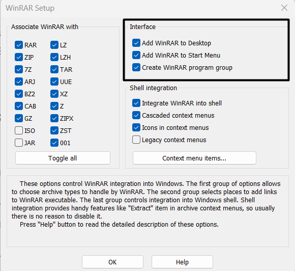 4。次のウィンドウで、 チェックマークwinrarをデスクトップに追加しますそしてwinrarをスタートメニューに追加しますシステムのデスクトップとスタートメニューにWinRARショートカットを追加するチェックボックス。