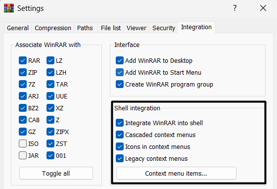 3。設定ウィンドウが開いたら、 それに行きます統合タブとのすべてのオプションを確認しますシェル統合セクション。