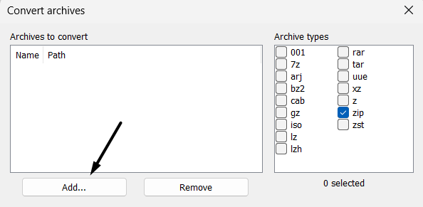 3。をクリックします追加…のボタンアーカイブを変換しますプロンプト、そしての道に行きます追加するファイルを選択しますそのファイルが保存されているウィンドウは、別の形式に変換する必要があります。