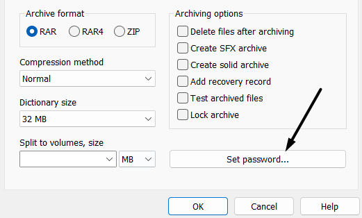 4。希望のファイル形式をから選択しますアーカイブ形式セクション クリックしますパスワードを設定する…