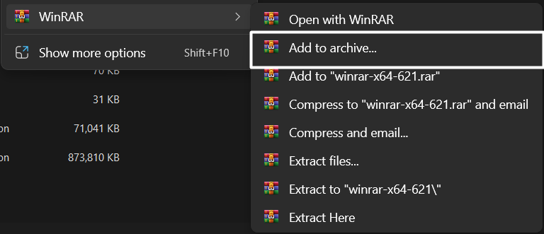 3。をクリックしますアーカイブに追加…winrar submenuのオプションを使用して、新しい名前を割り当てます。