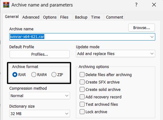 4。新しいアーカイブに名前を付けますアーカイブ名フィールドに、下のアーカイブファイルタイプを選択しますアーカイブ形式。 RAR、RAR4、ZIPの3つの異なるファイルタイプから選択できます。