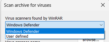 3。設定しますWinrarが発見したウイルススキャナーにドロップダウンしますWindows Defenderオプション。
