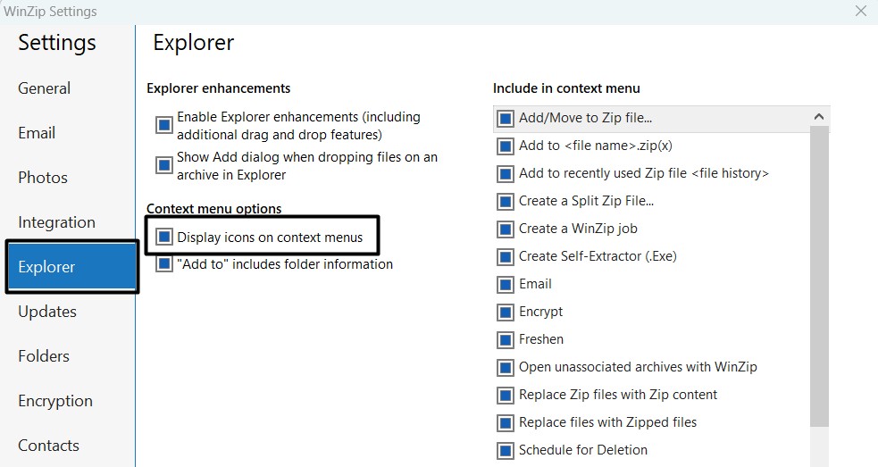 また、コンピューターの右クリックまたはコンテキストメニューにWinzipオプションを追加して、ファイルを簡単かつすばやくジップして解凍することもできます。以下の手順に従って、システムの右クリックメニューに追加します。