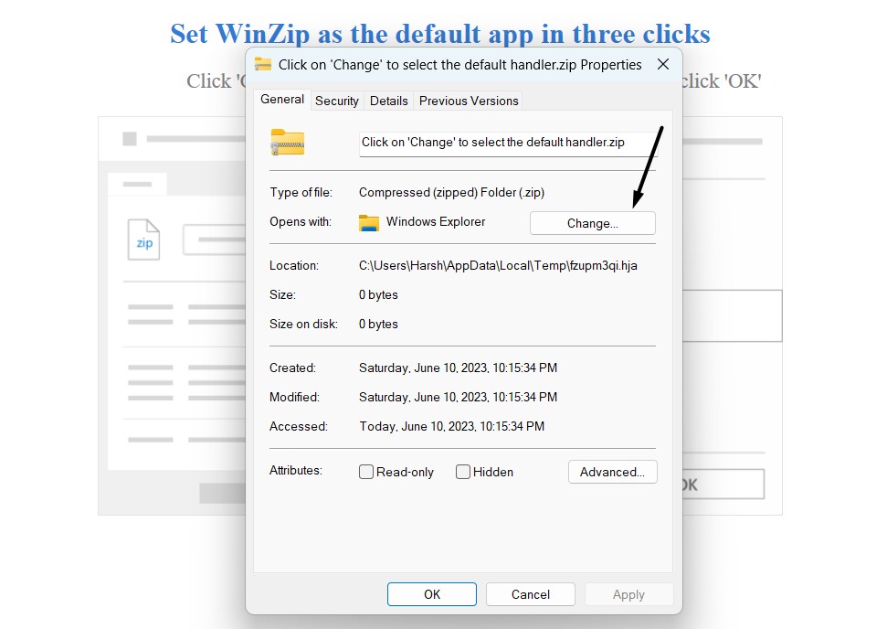 2。クリックします変化…次のウィンドウのボタンを選択してから選択しますwinzip次のプロンプトで。