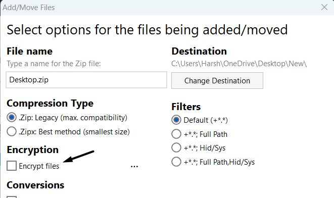 6。zipファイルをパスコードで暗号化する場合は、チェックマークを確認してくださいファイルを暗号化しますチェックボックス。
