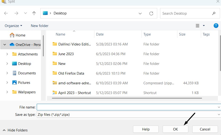 4。分割zipファイルを保存する場所に移動し、名前を付けて、わかりましたボタン。