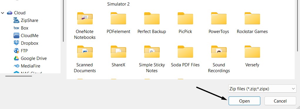 2。アーカイブが保存されているパスに移動し、選択して、クリックしますzipを開きます一番下に。