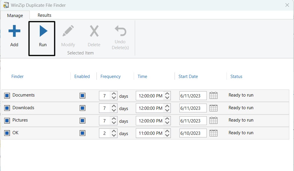 5。クリックします走るプライマリメニューのボタンは、選択したフォルダーに重複したファイルを見つけ始めます。