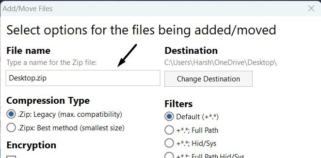 4。zipファイルに名前を付けますファイル名テキストフィールドをクリックしてください目的地を変更しますオプション。