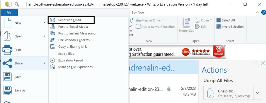 ヒント:Winzipを使用することもできますzipファイルをソーシャルメディアに投稿しますFacebook、LinkedInなどのように。Twitter、Microsoftチーム、Jabberなどのアプリに投稿することもできます。で同じことをするすべてのオプションがあります共有Winzipプログラムのサブメニュー。