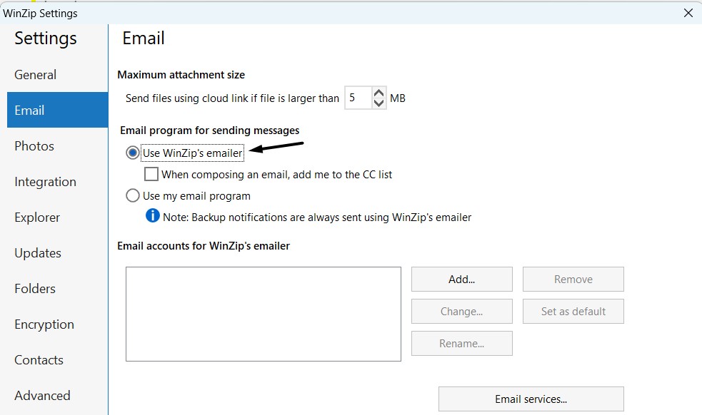 2。を選択しますWinzip設定ドロップダウンメニューからオプションを作成し、に移動しますメールセクション。
