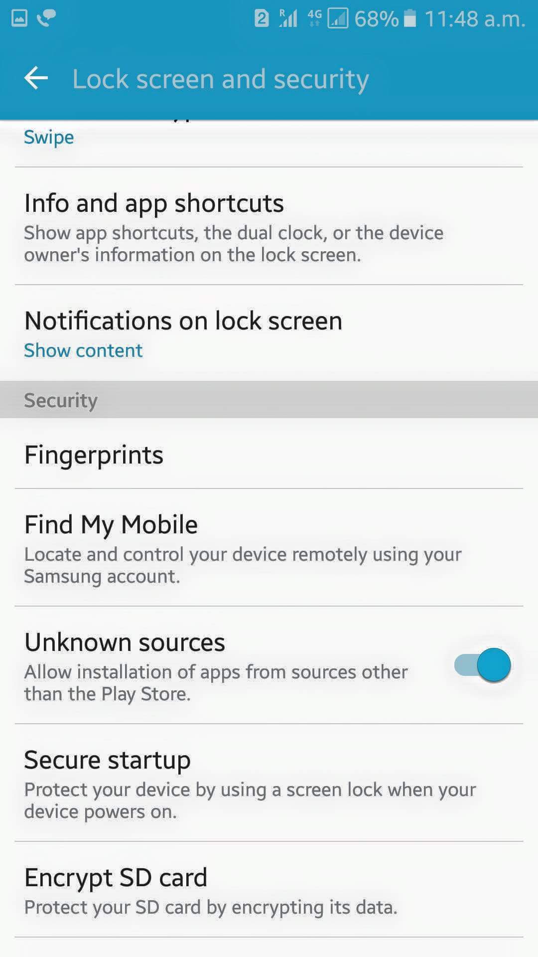 Samsung Androidスマートフォンまたはタブレットを開く「設定"アプリと下にスクロールします「スクリーンとセキュリティのロック」それをタップすると、見つかります不明なソースサブメニューで。