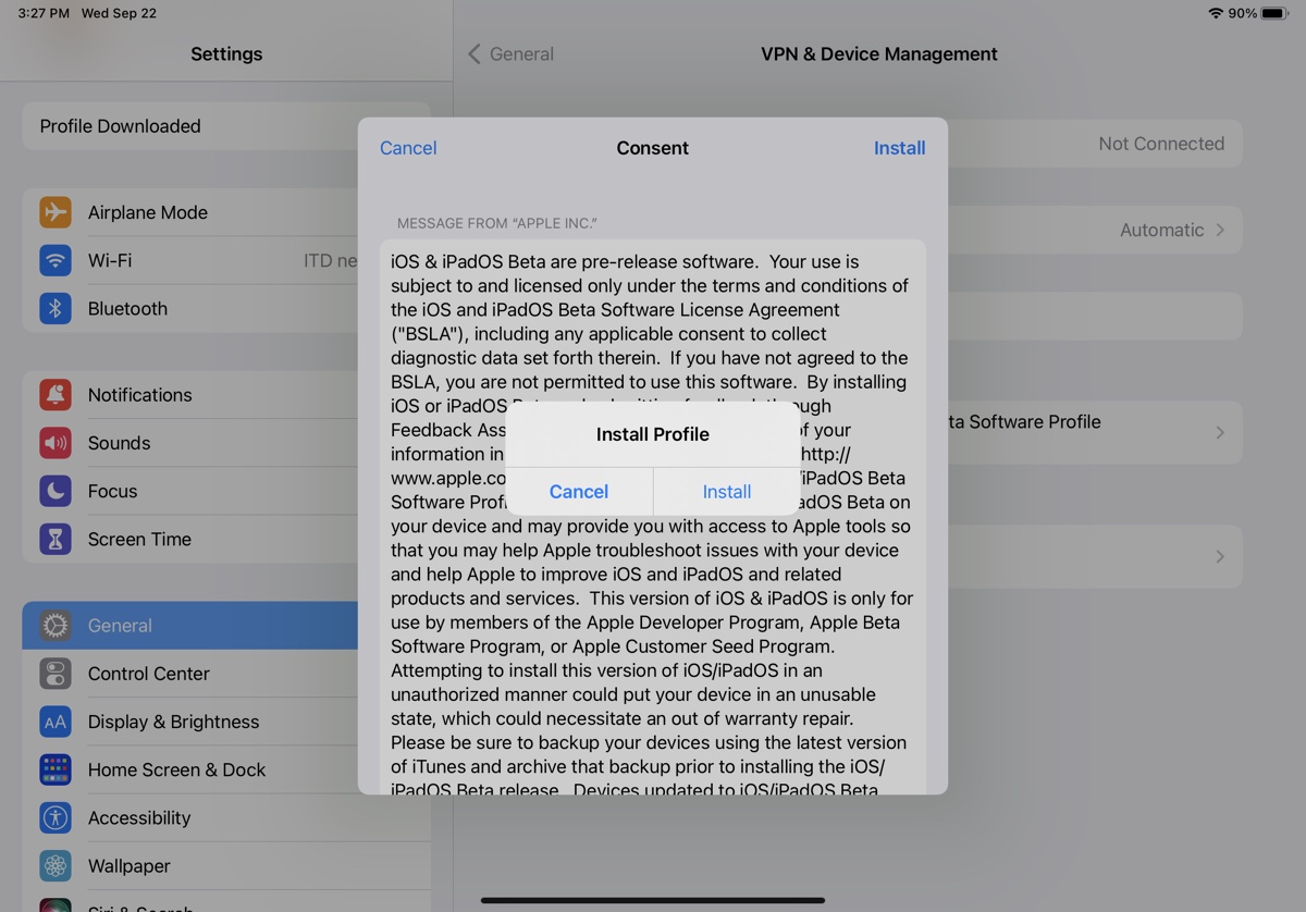 - 開けるダウンロードiPadのSafariで探してくださいiPados 15.6ベータ。タップしますプロファイルをインストールします。これにより、ダイアログボックスが開き、タップします許可する。
