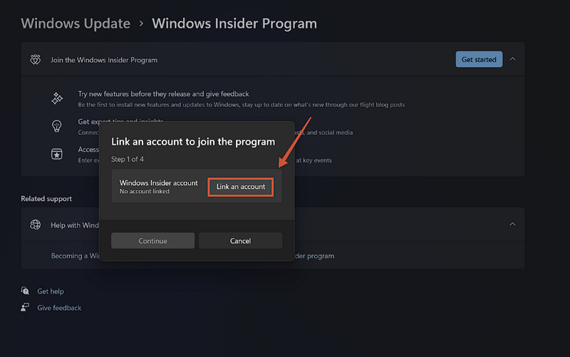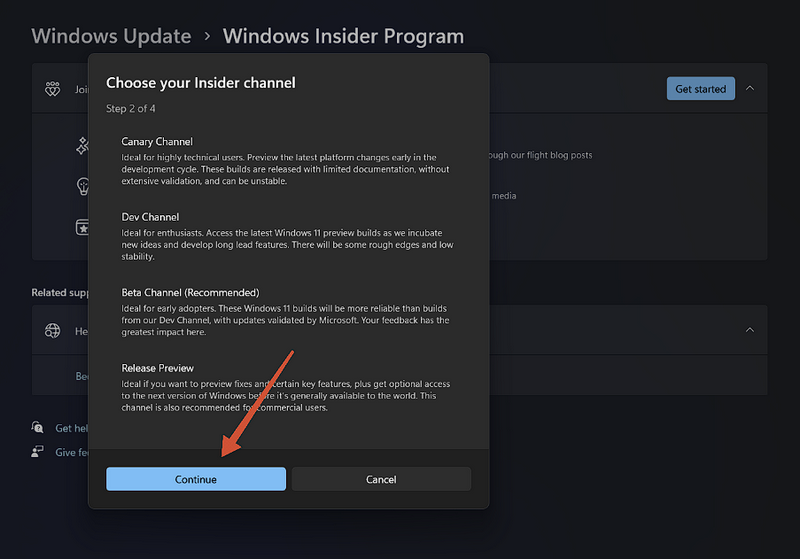 6。次に、インサイダーチャネルを選択するように求められます。ここでは、を選択できますプレビューチャネルをリリースしますをクリックします[続行]ボタン続行する。