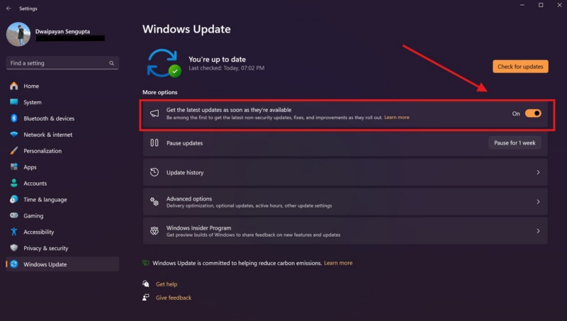 3。右ペインで、のトグルが利用可能なオプションになったらすぐに最新の更新を取得しますは有効になっています。