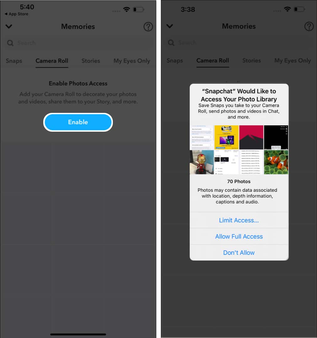 About About Photosアプリアクセスから、3つのオプションのいずれかを選択します。アクセスが制限されています特定の写真を選択するには、フルアクセスを許可しますライブラリ全体の場合許可しないでくださいアクセスを完全に拒否します。