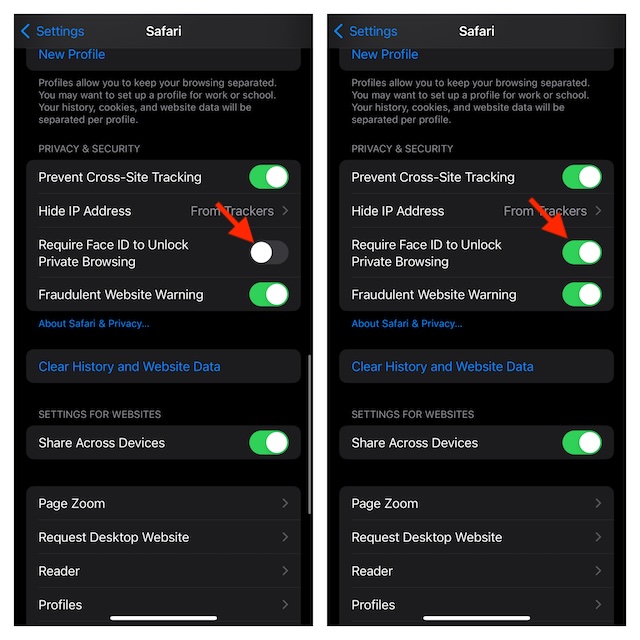 - に向かいますプライバシーとセキュリティセクションで、次のトグルを確認してくださいフェイスIDまたはタッチIDが必要です プライベートブラウジングのロックを解除しますオンです。