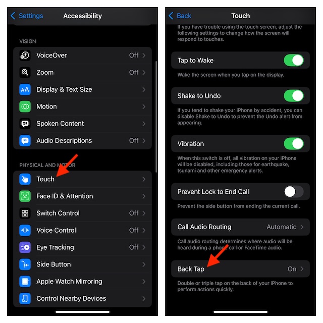 - 次に、画面の下部までスクロールして選択します「バックタップ」。