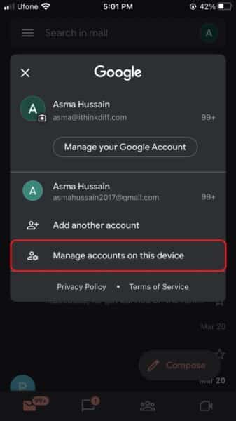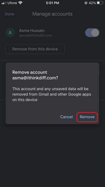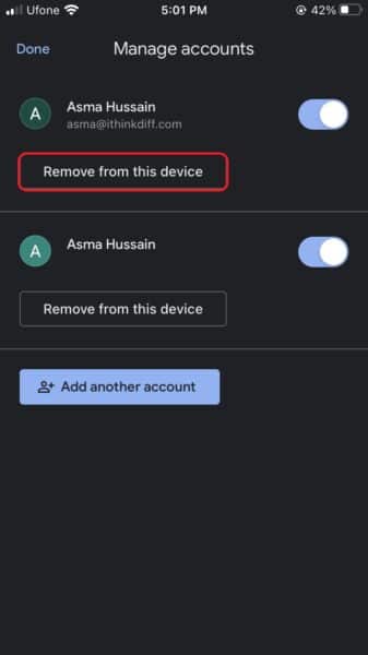 - をクリックした後このデバイスのアカウントを管理しますボタン、iPhoneに登録されているすべてのGmailアカウントのリストが表示されます。ログアウトするアカウントを選択して、このデバイスから取り外しますボタン。 Gmailアカウントを削除すると、YouTube、Googleマップ、Googleドライブなど、iPhoneの他のすべてのGoogleアプリから署名します。