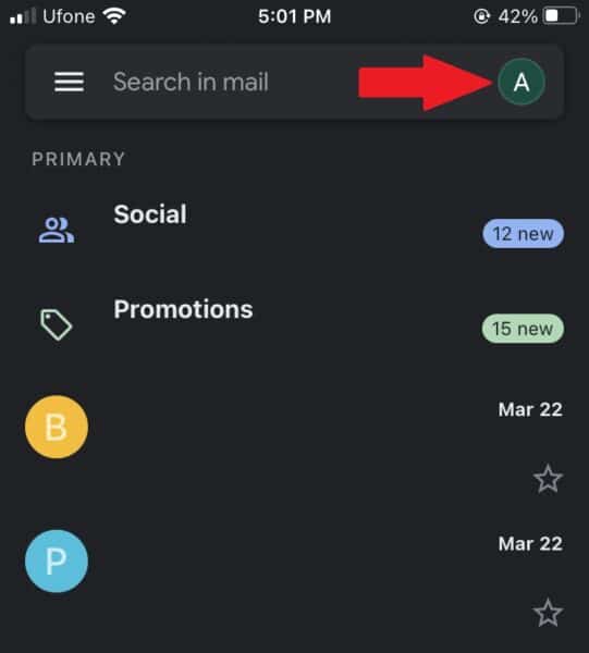 - iPhoneでGmailアカウントからログアウトする最初のステップは、デバイスでGmailアプリを開くことです。検索ボックス内の画面の右上の角にあるアカウントのプロフィール写真が表示されます。