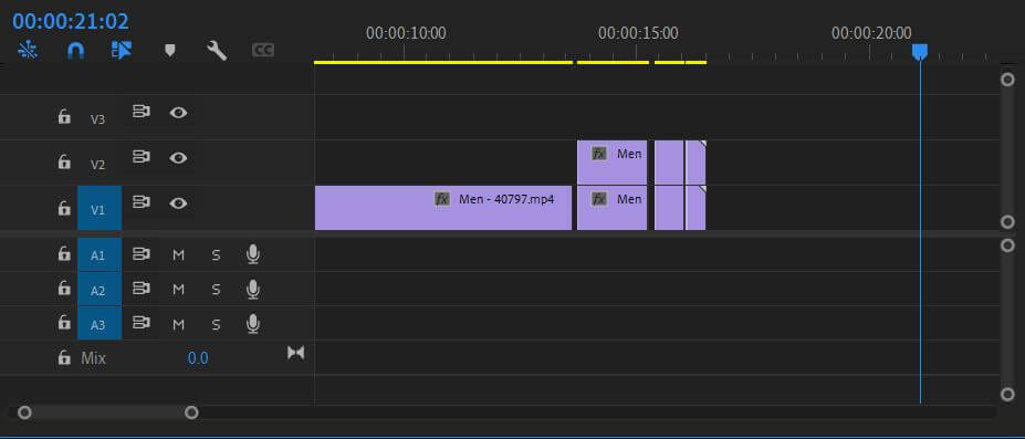 - 次に、右クリックしてすべてのスプリットアップクリップを選択してコピーし、元のクリップの上のV2タイムラインに貼り付けて、重複したレイヤーを作成します。