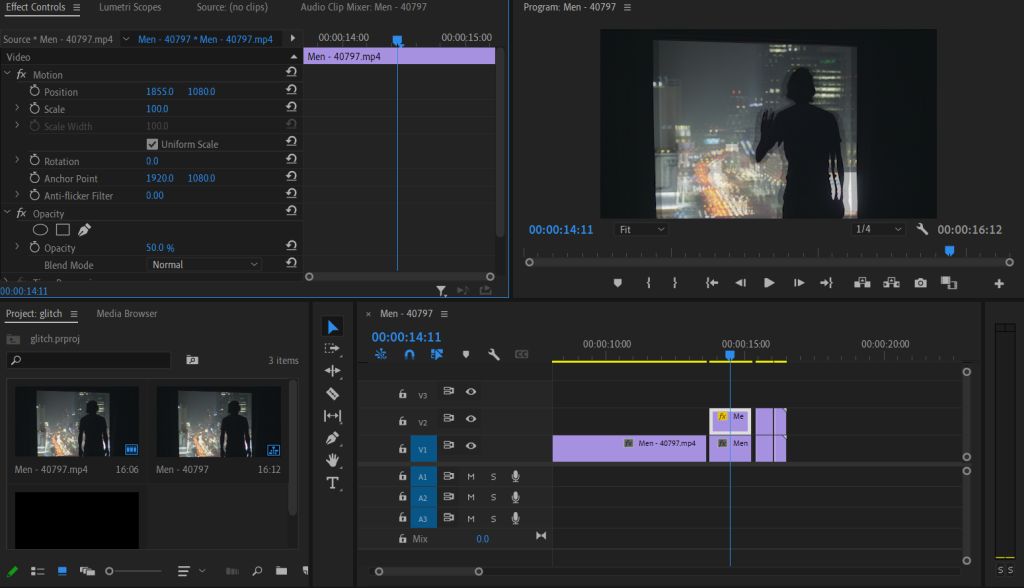 - 重複したクリップのいずれかを選択して、効果コントロールパネル。に行きます不透明値、そしてそれを設定します50%。その後、モーションドロップダウン、変更します位置オーバーレイの複製クリップがオリジナルからわずかにオフになるように値。残りの複製でもこのステップを実行します。あなたは、グリッチに多種多様なものを作成するために、位置と場合によってはスケール値を変更したいと思うでしょう。 Blendモードで再生して、さまざまなルックスを取得することもできます。