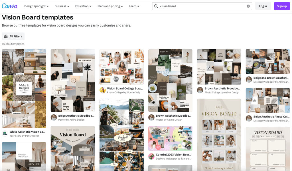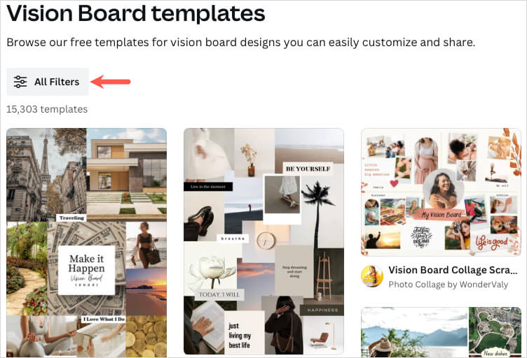 幸いなことに、Canvaは非常に多くの無料ビジョンボードテンプレートを提供しているため、セット全体を閲覧せずに好きなものを見るでしょう。テンプレートのコレクションをチェックしてオプションをフィルタリングする方法は次のとおりです。