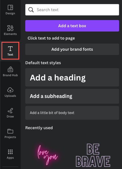 テキストを追加するには、選択してください文章サイドバーで。その後、スタイル、フォントの組み合わせを選択したり、空のボックスを追加してテキストを入力したりできます。